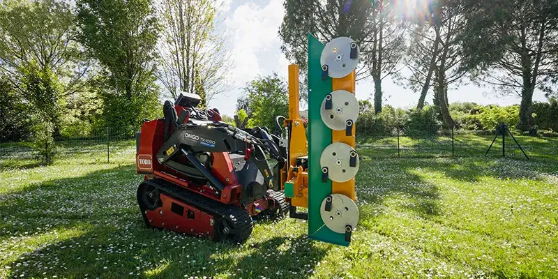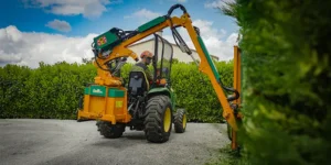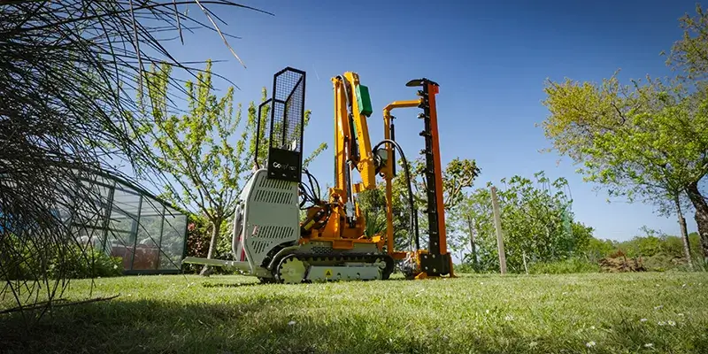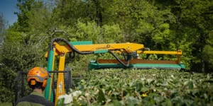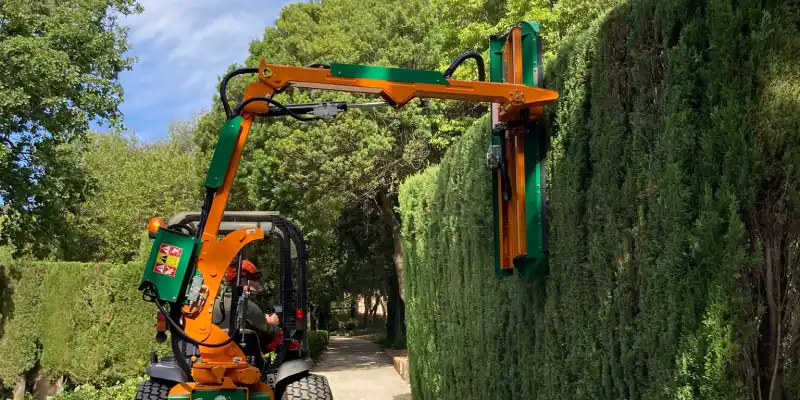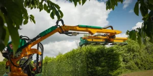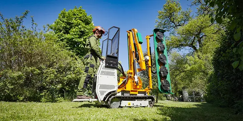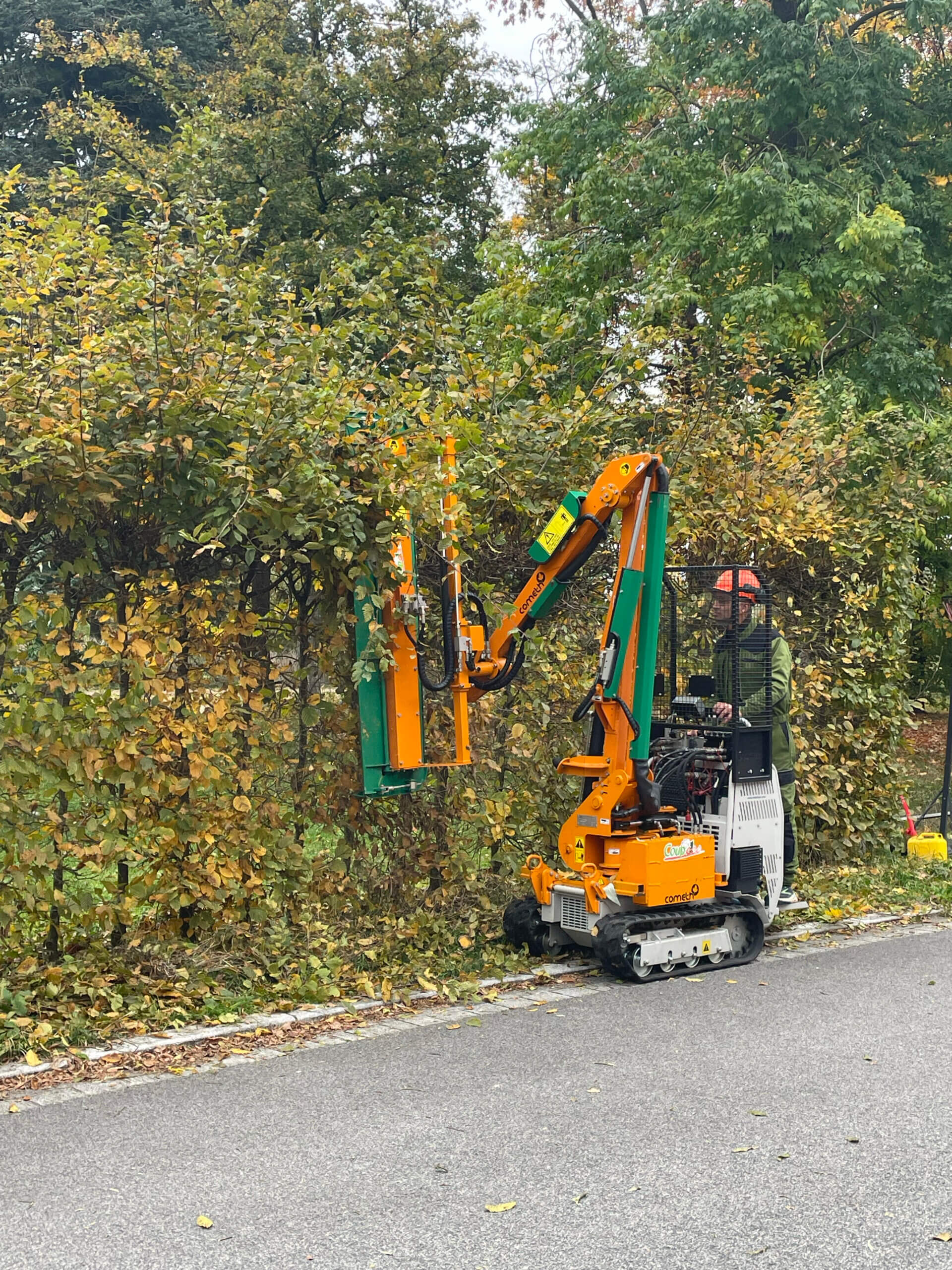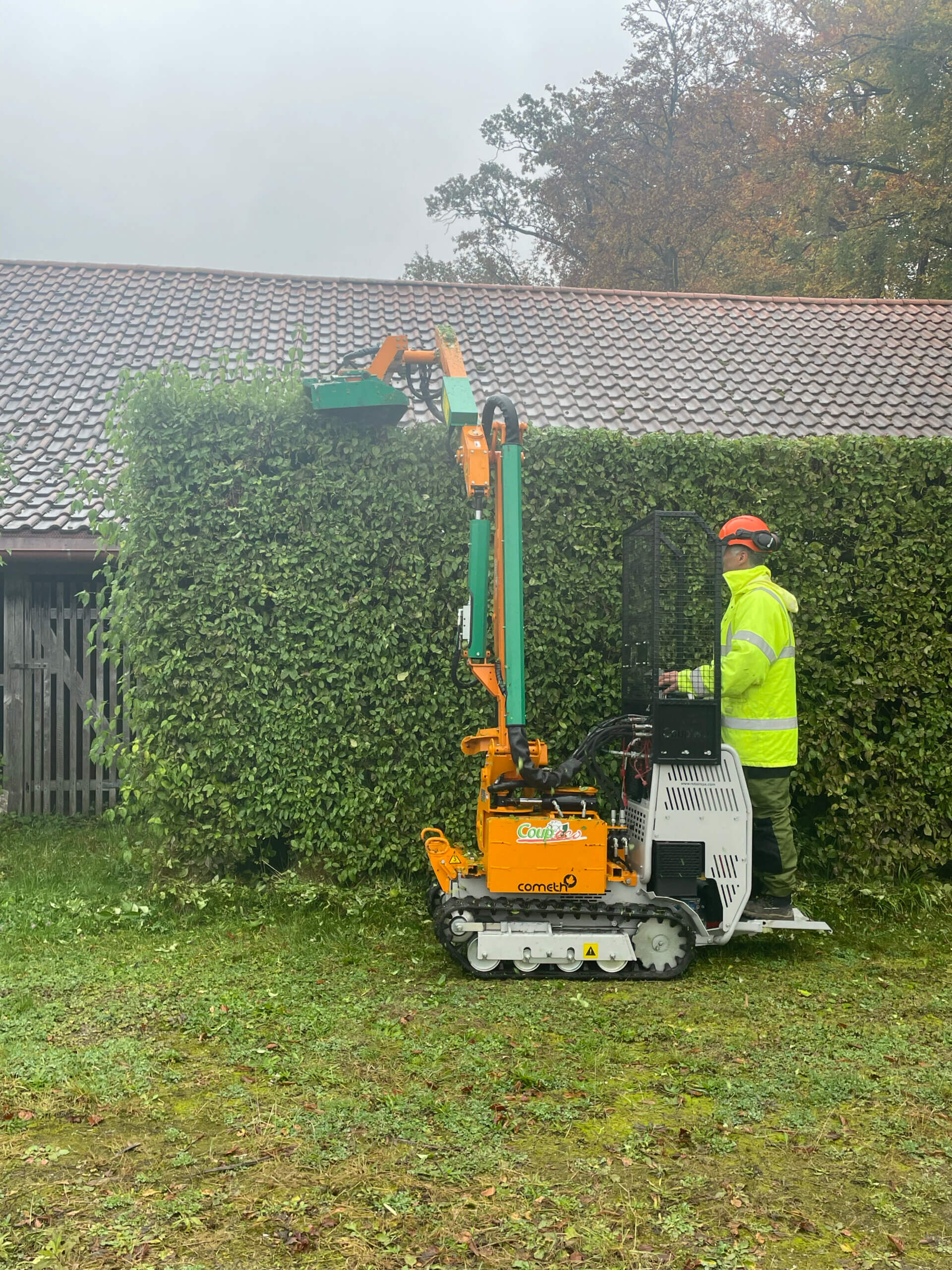 Cometh 320 – Heckenschneidgerät zum Aufbau auf das Raupenfahrzeug Rampicar R80, einsetzbar in Engstellen ab 80 cm – Schnitthöhe horizontal 3,20 m, Schnitthöhe vertikal 4,47 m – 5 Messerscheiben á 42 cm für Aststärken bis 25 mm oder 5 Kreissägeblätter á 42 cm für Aststärken bis 70 mm – das hydraulische Doppel-Parallelogramm ermöglicht das Halten des Schneidbalkens in der gleichen Position, unabhängig von den Auslegerbewegungen
