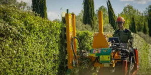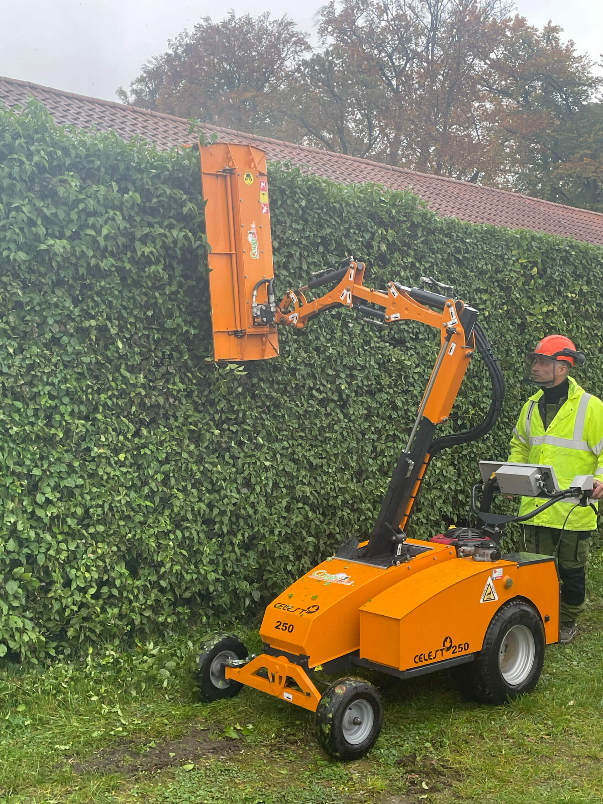 Celest 250 – selbstfahrendes, handgeführtes Heckenschneidgerät – hydrostatischer Fahrantrieb, hydraulische vordere Lenkachse, Benzin-Motor, Schnitthöhe horizontal 2,50 m, Schnitthöhe vertikal 3,90 m, 3 Messerscheiben á 40 cm für Aststärken bis 20 mm, der synchronisierte Schneidbalken sorgt für einen perfekten geraden Schnitt der Hecke