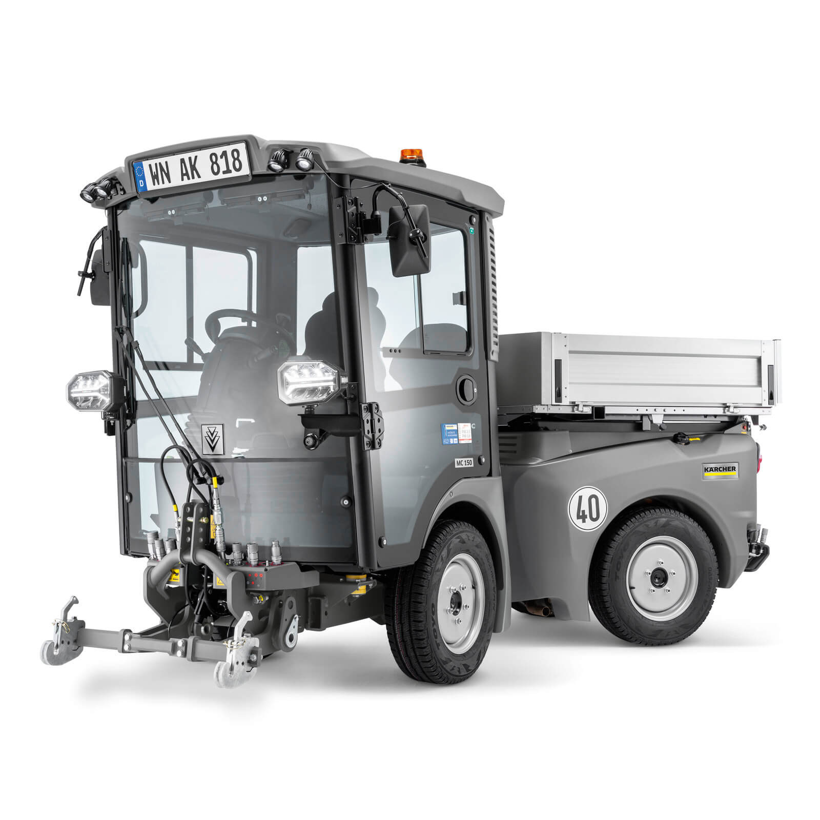 KÄRCHER MUNICIPAL MC 150 – minimale Abmessungen – maximale Leistung – Die kompakt konstruierte MC 150 mit einer 2-Personen-Kabine aus der 3,5 Tonnen-Klasse mit 48 kW (66PS) überzeugt durch die vielfältigen Einsatzmöglichkeiten. Von der Straßen- und Nassreinigung, Grünflächenpflege und Winterdienst punktet der Geräteträger mit Multifunktionalität und maximaler Leistung. Die MC 150 darf mit Führerscheinklasse B gefahren werden!